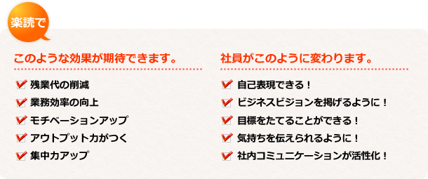 企業研修やセミナーにおいて「営業効率や事務処理能力を上げるためのビジネス速読(楽読)」を提供し、多方面で実績を挙げています。 活字処理能力が上がると情報収集力が向上し、お客様に対する提案力が大幅に強化。また事務処理時間を短縮し、作業効率を飛躍的に向上させることも可能となります。